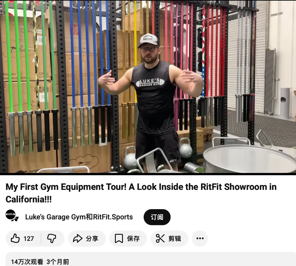 博主发布了播放量高达 14 万次的《My First Gym Equipment Tour! A Look Inside the RitFit Showroom in California!!!》探店视频,第一次实地参观 RitFit 在加州的 showroom,并带观众看里面的器材陈列与空间布局。该视频收获100+点赞,成为推动成交的强效催化剂。
