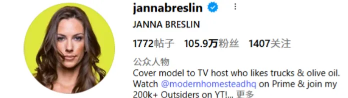 @Janna Breslin(105.9 万粉丝)是这层的核心案例 。她的受众偏美国女性与生活方式人群,兼具健身、户外审美。