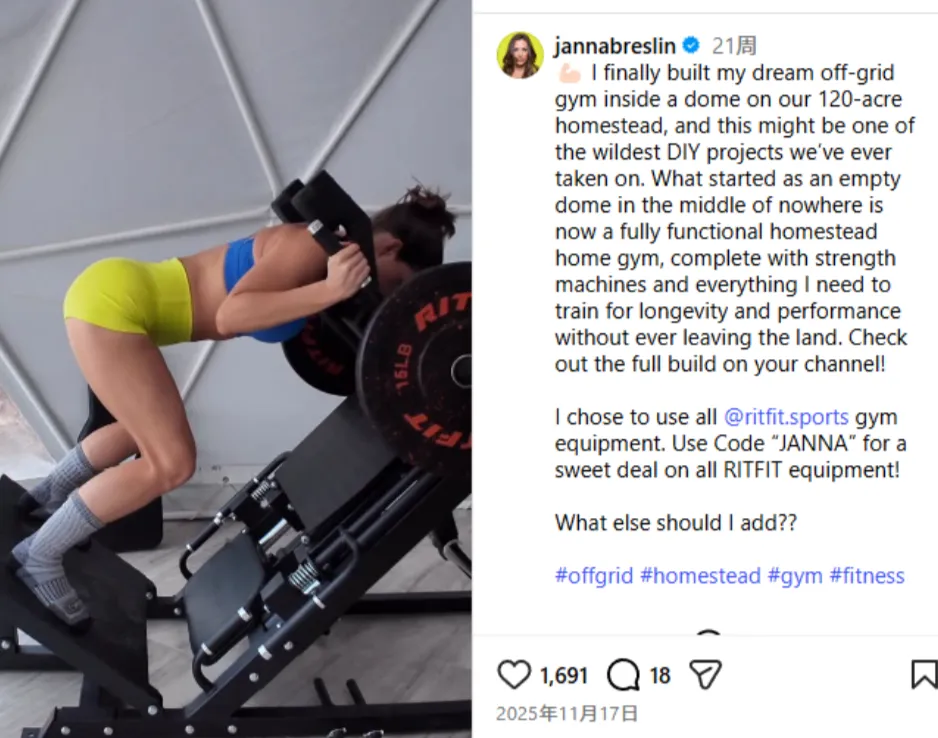合作并非生硬带货,而是她发布视频,展示自己在 120 英亩土地上的穹顶建筑内搭建了梦想中的“离网健身房(off-grid gym)”,里面完全使用了 RitFit 设备 。这类 Reel 收获了约 1332 赞(25 评论)和 1691 赞(18 评论),成功将笨重的铁器包装成了向往的中产生活符号 。