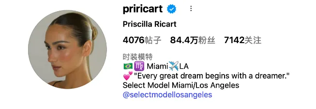 @Priscilla Ricart (priricart)(84.4 万粉丝)作为贴近 LA 本地潮流的达人,她的语境通常是“girly pop workout”或“home workout aspiration” 。
