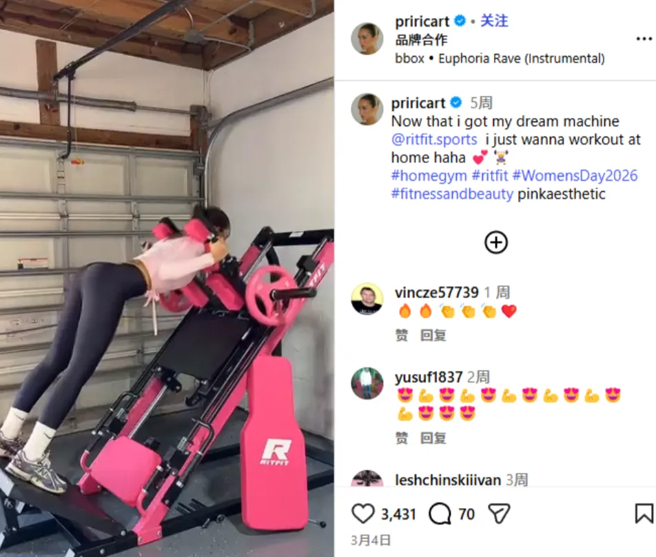 她的合作内容 “Now that i got my dream machine... just wanna workout at home” 直接带火了粉色史密斯机。视频获 3431 赞和 70 条评论,视频中极具视觉冲击力的粉色史密斯机(pink aesthetic),证明了 RitFit 正在主动吸纳偏 lifestyle 和 city-event 的年轻女性受众。