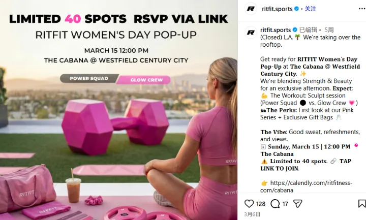 如何让动辄占据大半个车库、重达数百磅的力量器械,拥有令人共鸣的温度?RitFit 将“事件化营销”玩到了极致 ,其中针对“三八国际妇女节(Women's Day)”的策划,堪称高客单耐用品“去硬核化”的典范之作,将冷门重型器械转化为“女性关怀”与“情绪价值”。