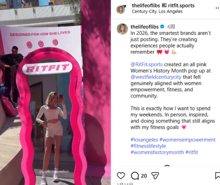 巨大的 KOL 裂变效应:活动现场设置了“DESIGNED FOR HOW SHE LIVES”(专为她的生活方式设计)的粉色波浪形打卡镜。社媒博主 thelifeoflibs 忍不住在 IG 上发文盛赞:“在 2026 年,最聪明的品牌不仅是在发帖,而是在创造让人真正记住的体验。这场全粉色的妇女节快闪活动,真正地契合了女性赋权、健身与社区精神。这就是我周末想做的事。”