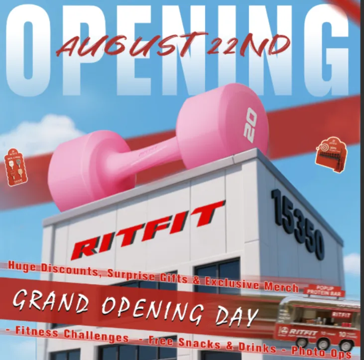 除了节日快闪,RitFit 在加州实体 Showroom 的 Grand Opening Day(盛大开业日,8 月 22 日)也是一场营销盛宴。不仅提供 Huge Discounts(巨额折扣)和 Surprise Gifts(惊喜礼物),更是通过 Fitness Challenges(健身挑战赛)、Free Snacks & Drinks(免费小吃饮料)以及 Photo Ops(打卡拍照区),将一个线下门店开成了嘉年华 。
