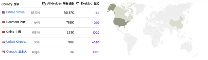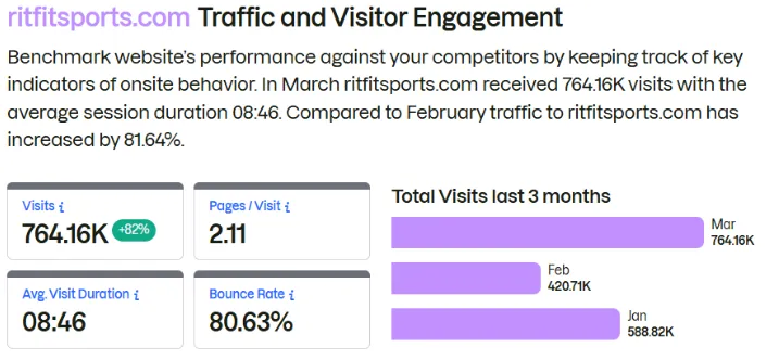 品牌独立站 (ritfitsports.com):核心心智高地。2026 年 3 月估算访问量约 76.4 万,其中美国流量占比高达 87.23%。