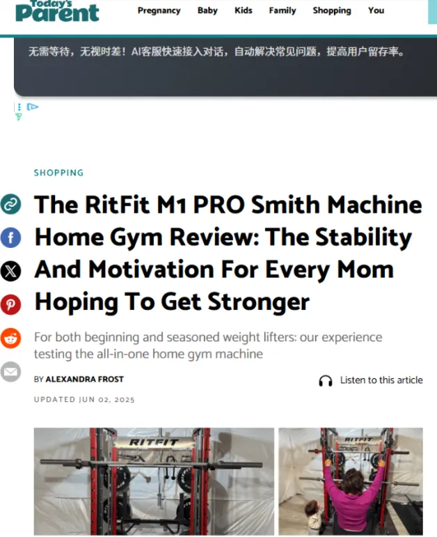跨界媒体的温情攻势,打破场景壁垒:为了让庞然大物走进普通家庭,他们获得了知名家庭亲子媒体《Today’s Parent》的报道。文章巧妙地将 RitFit M1 Pro 放进“妈妈也能在家力量训练”的温情语境中。