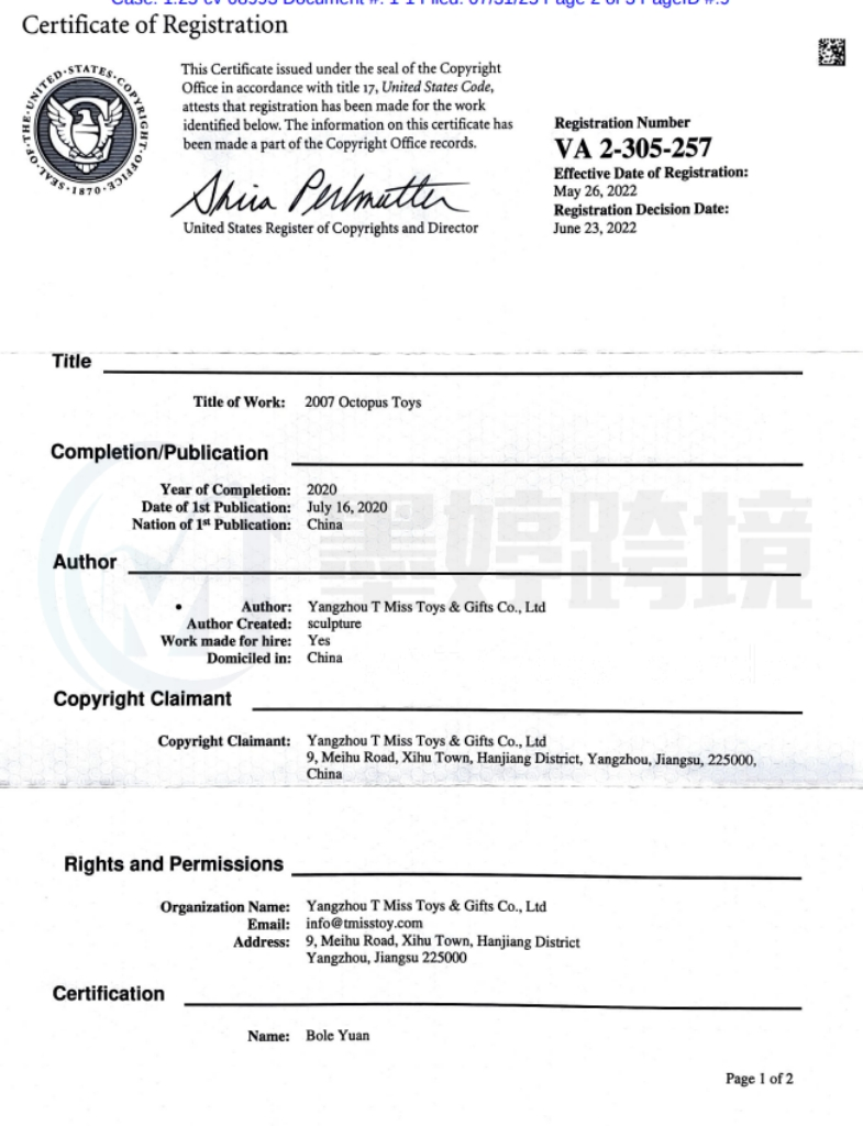 T MISS TOYS 拥有多个自主原创图样及形象设计,并已在美国进行了版权登记。近期,品牌方已通过法律手段开展维权。我们建议卖家及时排查是否使用了相关图片或产品造型,避免侵权风险。