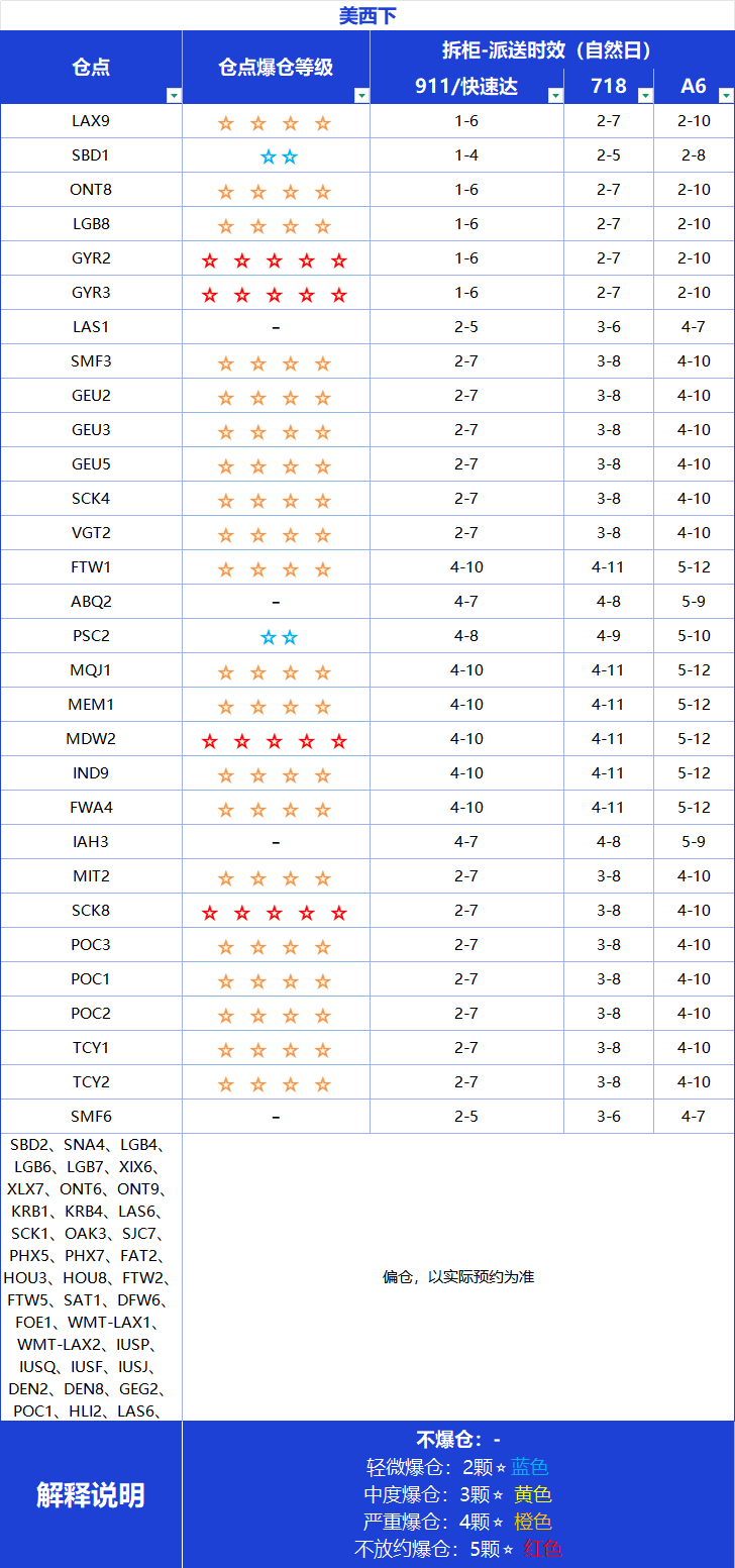 以下是当前美线的爆仓情况,以及我司各热门渠道针对各热门仓点的末端作业时效。