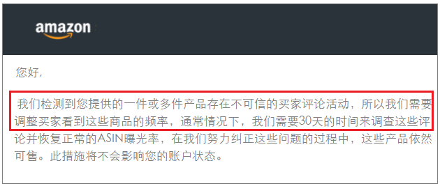 最近在我的私密圈里,有不少卖家都提到了过年开工之后收到了亚马逊的一封邮件,邮件的内容是自己的产品因为存在不可信的买家评论活动,所以暂时被亚马逊降低了曝光频率,邮件的部分截图如下: