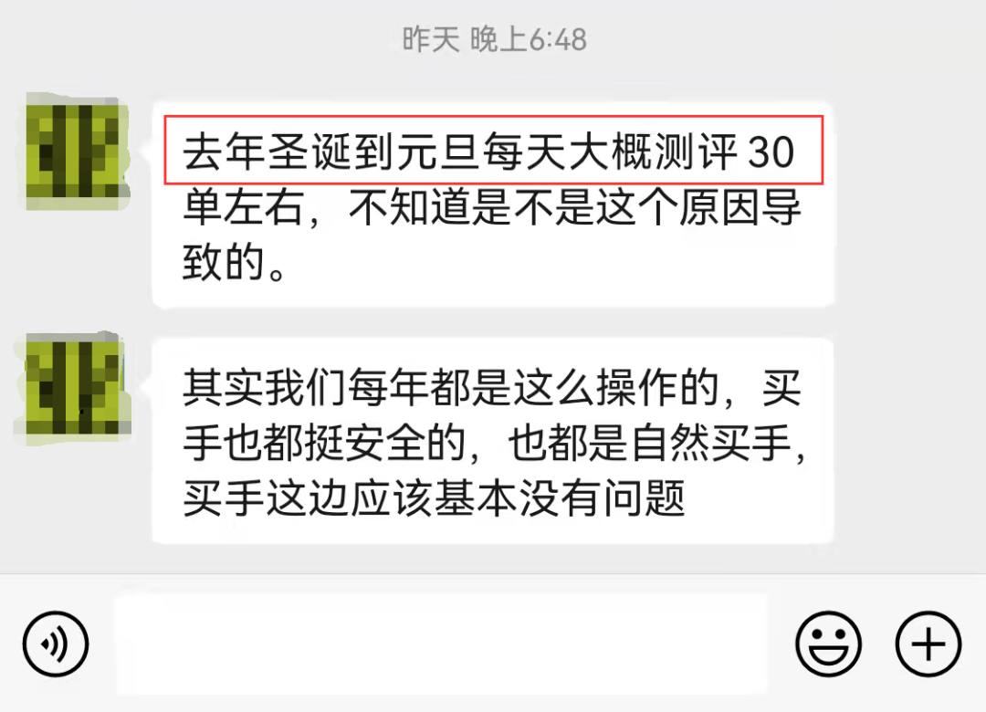 但是跟这些收到邮件的卖家在做了深入的交流以后,我得知了他们之前的运营策略,那就是在去年的圣诞旺季期间,为了维持住良好的产品排名,每人都进行了多方位的、大批量的产品测评,这是他们身上的共同点。