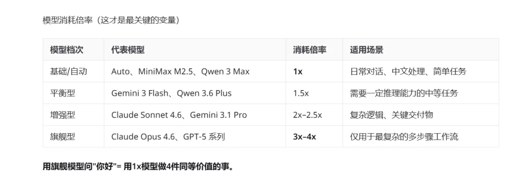 - 极复杂工作流(如多步骤爬取+分析+写报告)→ 才用旗舰(3–4x)