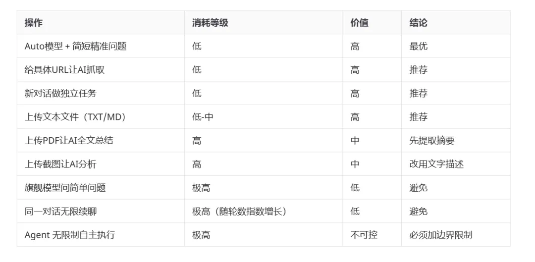 **做法:** 能复制文字就不截图;能上传 TXT/Markdown 就不上传 PDF。如果要让 AI 分析某网站,直接给 URL 让它抓文本,不要截图。