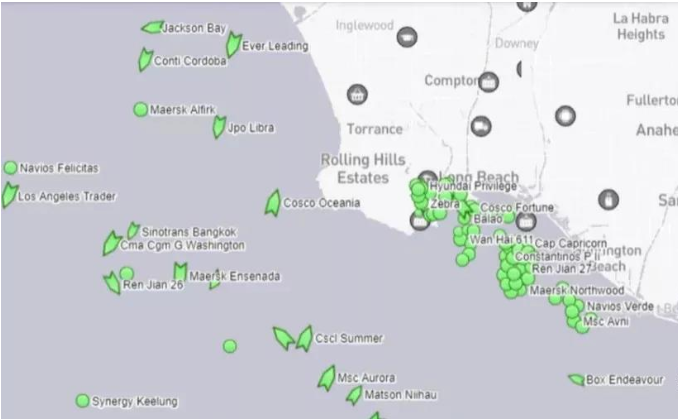 中美海运航线的核心枢纽——美国最大港口洛杉矶港已经堵成了一锅粥。73艘船滞留在加州港湾,超43万TEU,创造有史以来最高纪录;最倒霉的船已经等了差不多一个月。还有源源不断的船在赶来的路上。