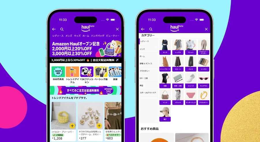 “Amazon Haul”这项服务,于2024年11月在美国推出,现在终于轮到了日本市场。该服务提供数十万种商品,涵盖时尚、室内用品和日用品等广泛类别,重点关注1000日元以下和3000日元以下的商品。订单总额超过2000日元可享受20%的折扣,订单总额超过3000日元可享受30%的折扣。