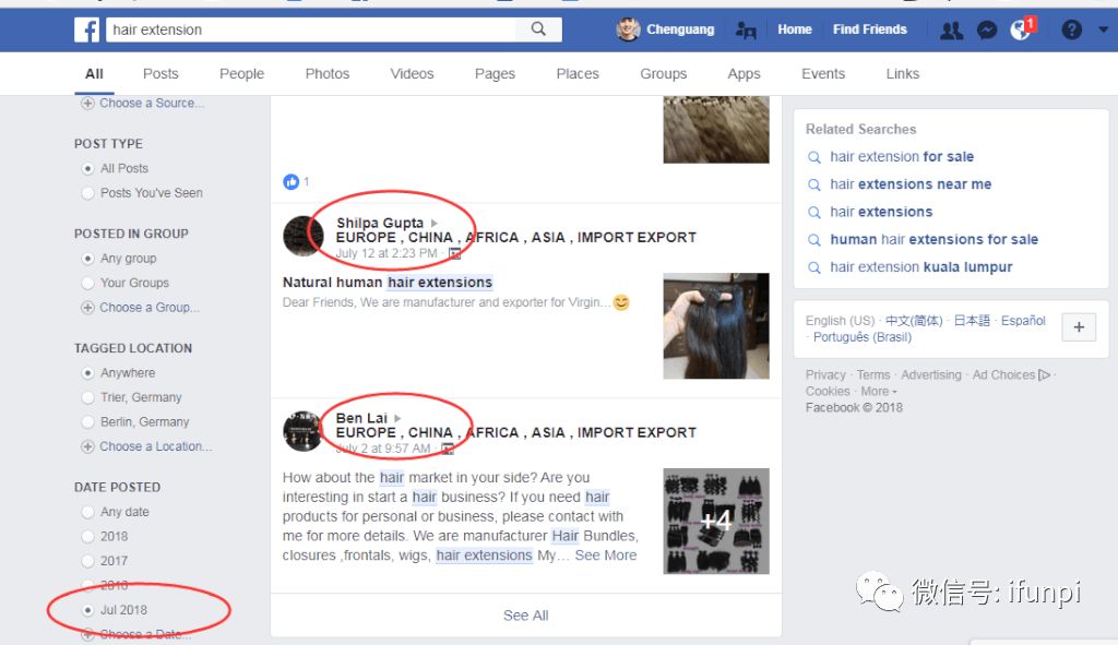 采用谷歌搜索语法 site:facebook.com "k likes" "hair extension" ,产品词可以替换,k代表的是几千,采用完全匹配的方式。likes可以换成comments,share等,k可以换成m,当然还可以使用其他的google搜索语法,比如inurl:videos,专门查找视频帖子。