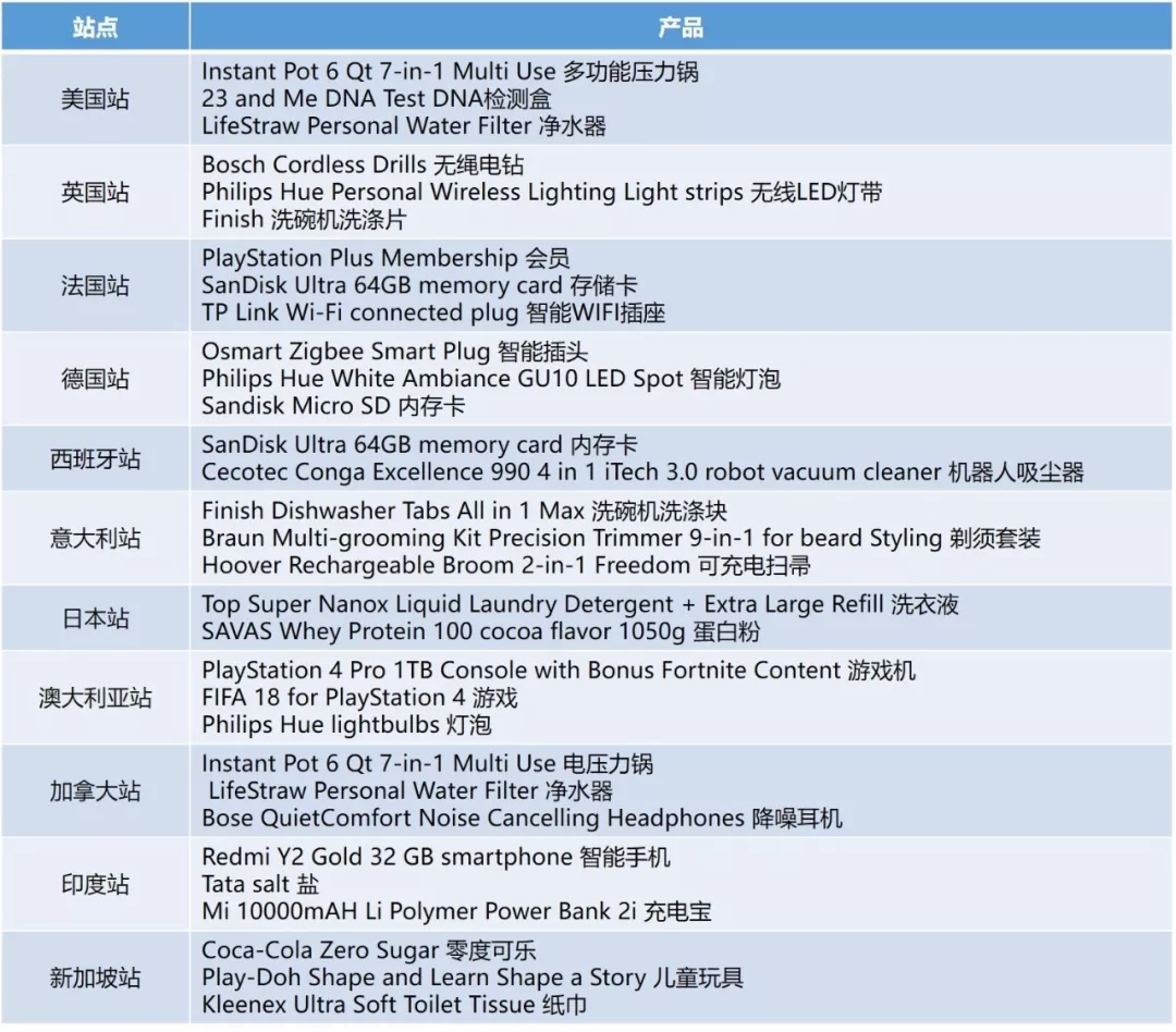 以下是2018年Prime会员日期间各国最畅销产品: