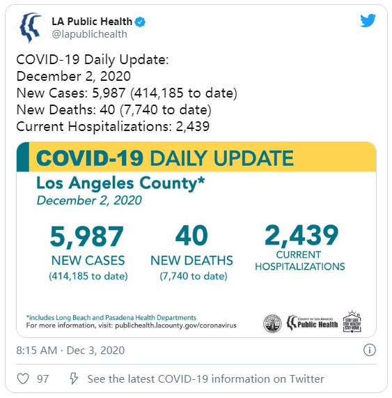 根据洛杉矶公共卫生局的说法,洛杉矶已确诊病例414,185例,死亡人数为7,740人。