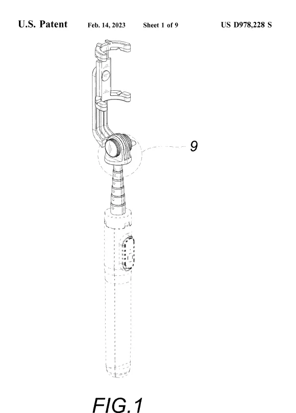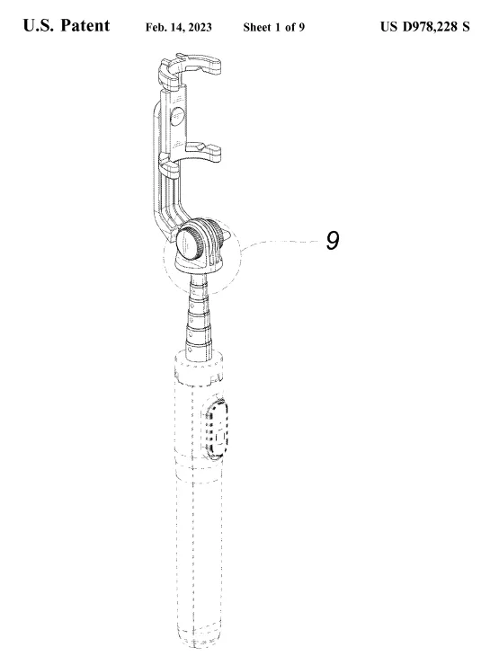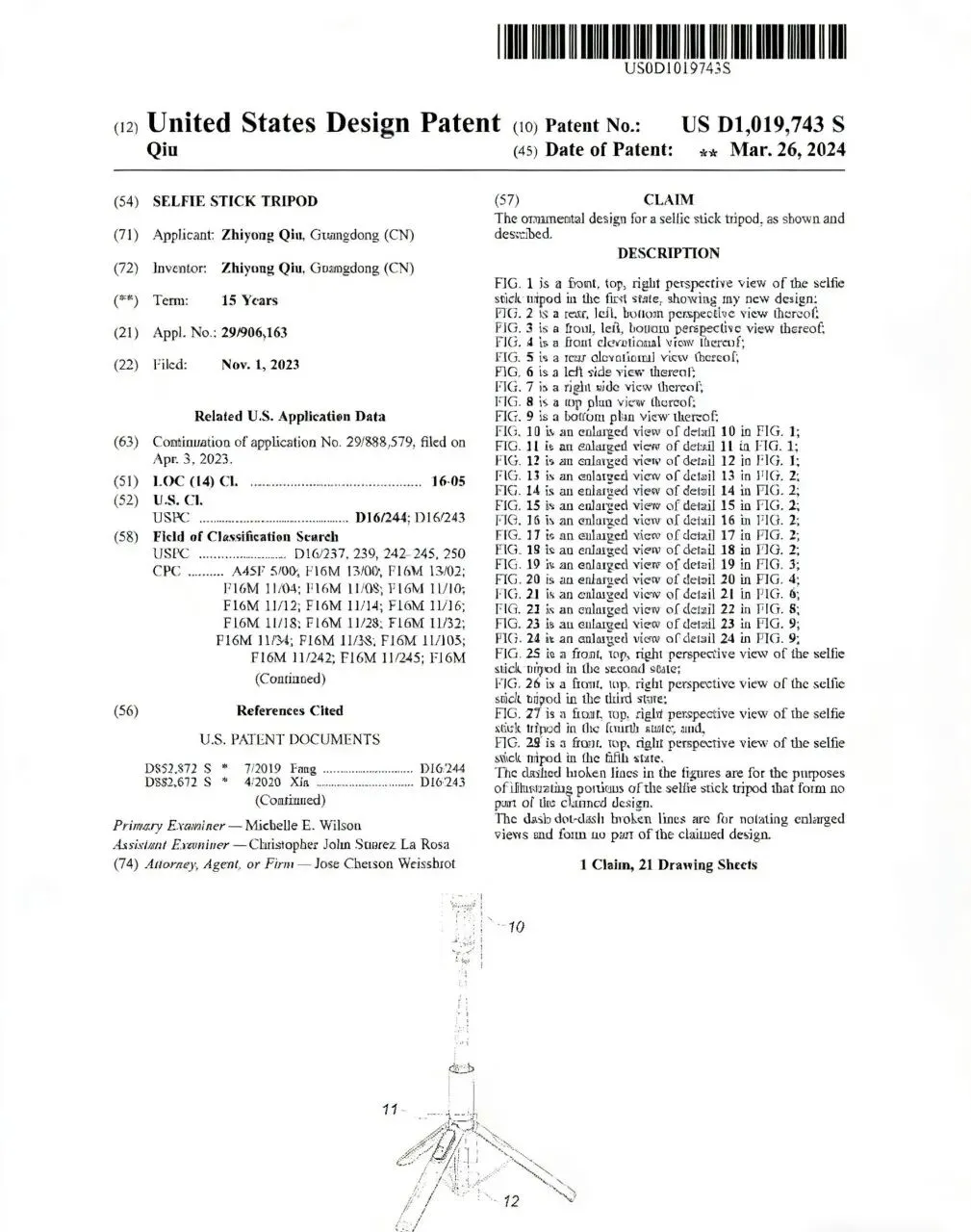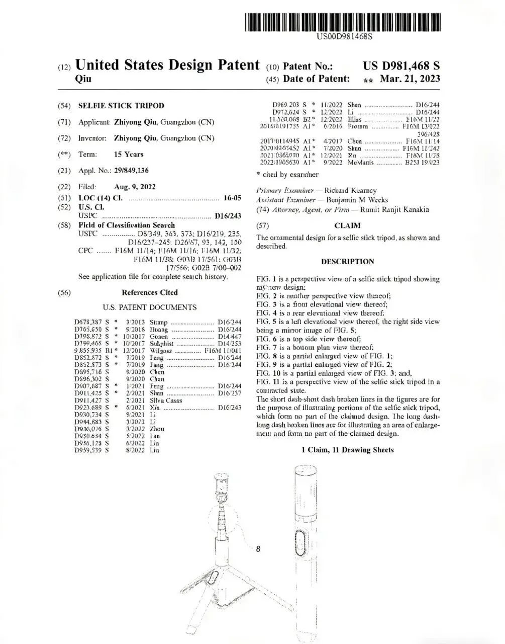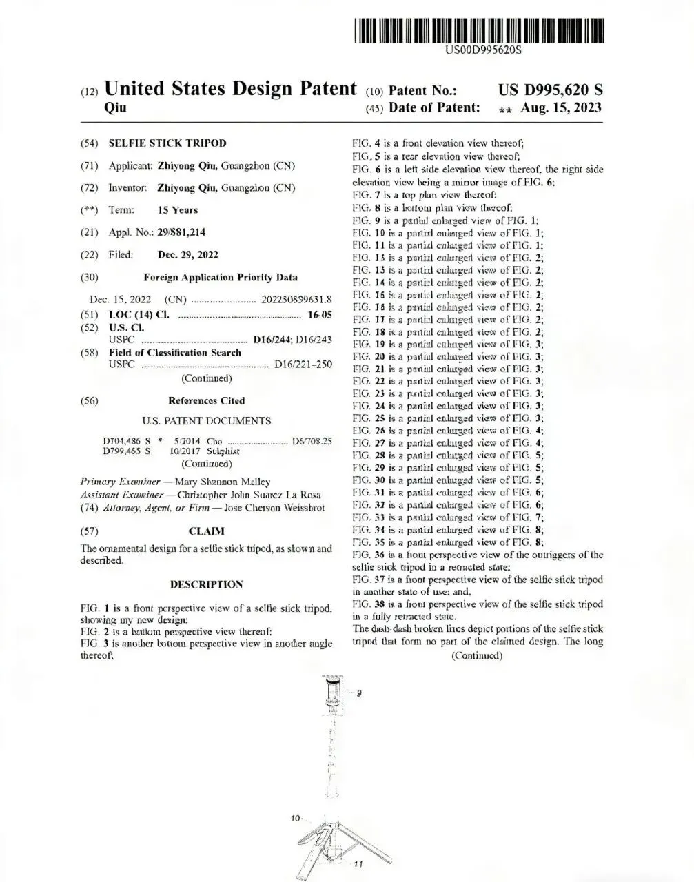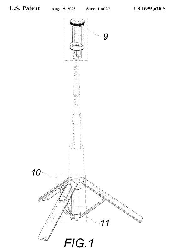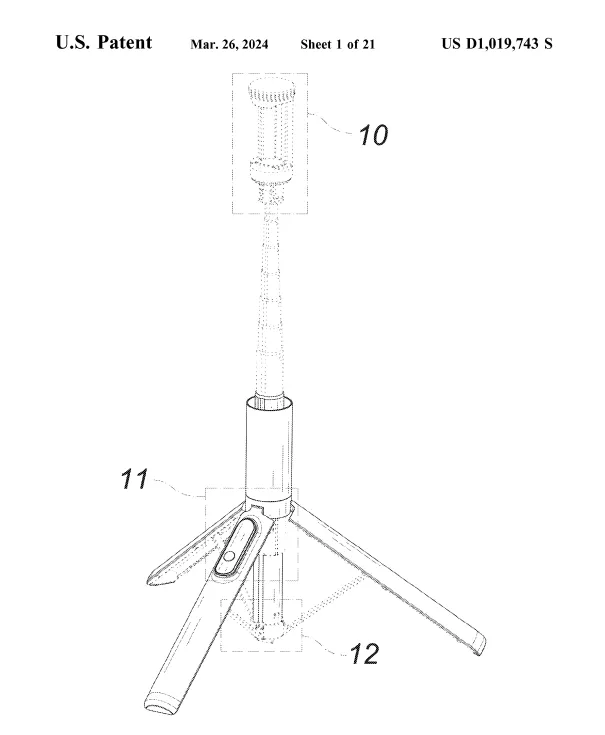 原告并未公开涉案专利文件,,查询到原告名下的4条自拍三脚架的专利符合原告所述,这四款外观的自拍杆要特别警惕侵权风险,虚线部分不受保护,自拍杆卖家可仔细查看比对细节: