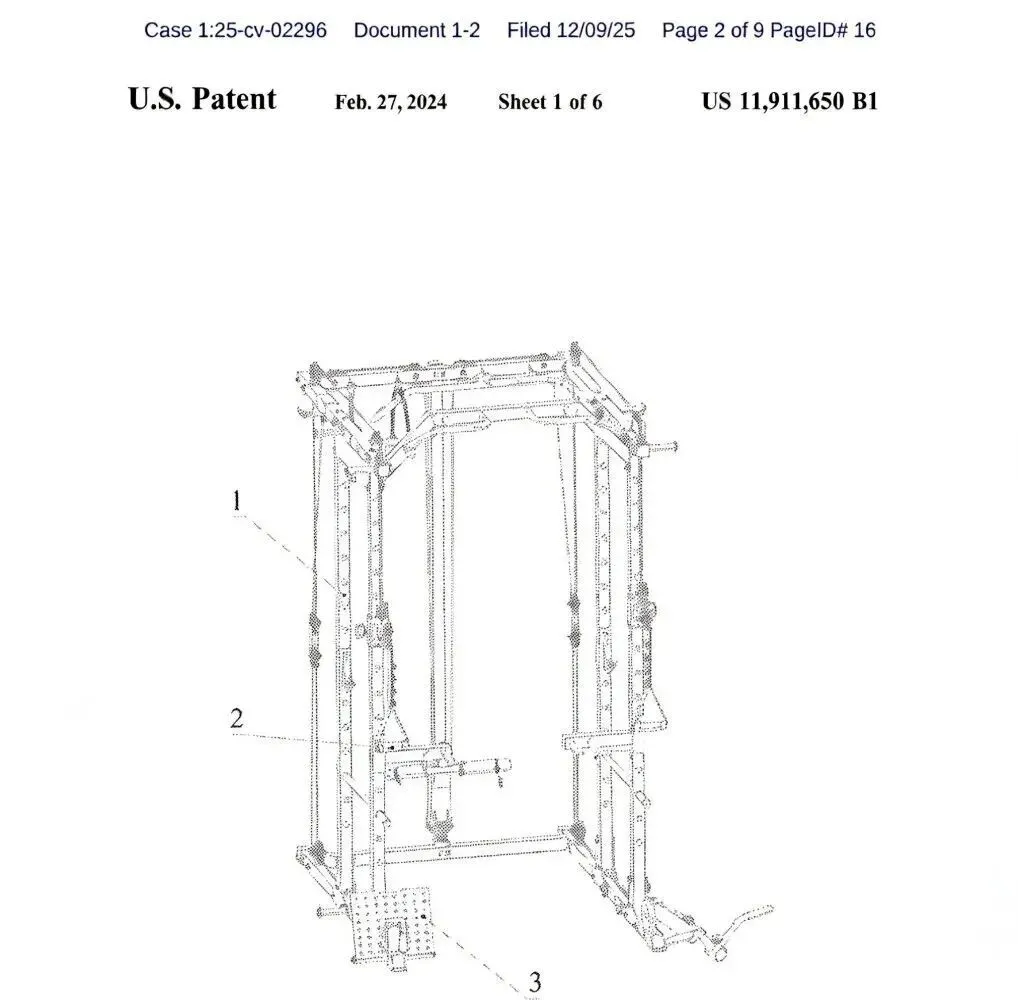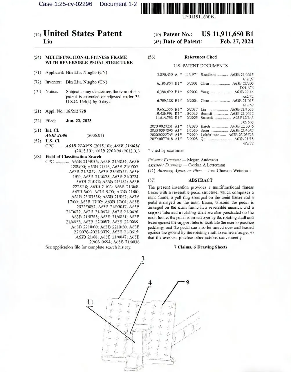 涉案专利为原告旗下的一款健身器材,专利编号US11,911,650B1, 是一项美国发明专利,于24 年 2 月 27 日下证,这个专利保护的是具备可翻转的踏板 + 支撑管 + 转轴,且能实现翻靠支撑管练划水、翻靠地面收纳不挡其他动作的两个功能。