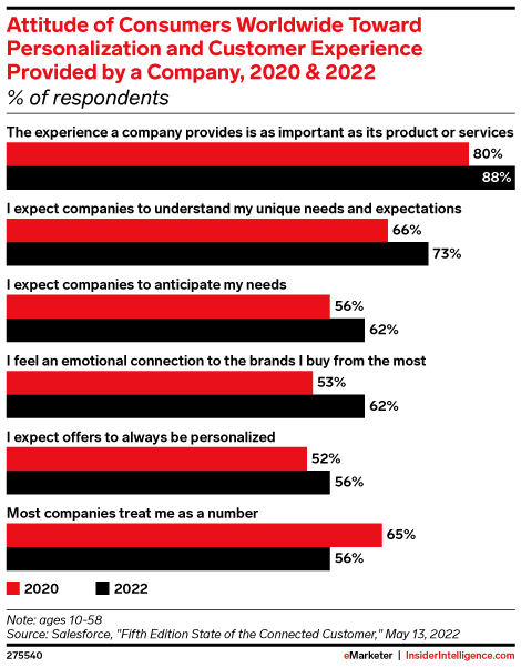 越来越多的客户要求品牌了解并预测他们的需求,88%的购物者认为品牌提供的体验与其产品一样重要。