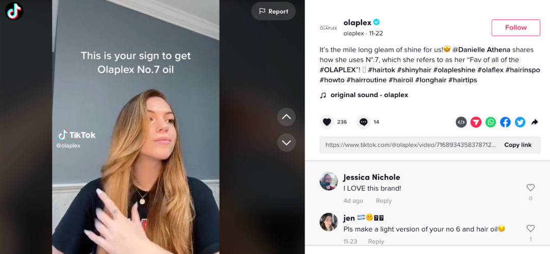 高级护发品牌Olaplex是利用TikTok美妆粉丝群的企业之一。#olaplex 标签目前在该平台上的浏览量为11亿。至于Instagram,该品牌拥有230万粉丝和1390万个#olaplex 帖子。