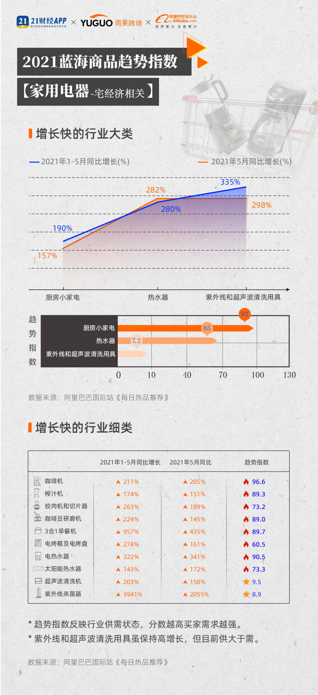 在外贸持续升温的上半年,究竟哪些品类表现最为亮眼?外贸行业的最新趋势有哪些?近日,我们联合21财经和雨果跨境发布了首期《2021新外贸指数》,一起来看看2021上半年的爆品和外贸行业大趋势吧!