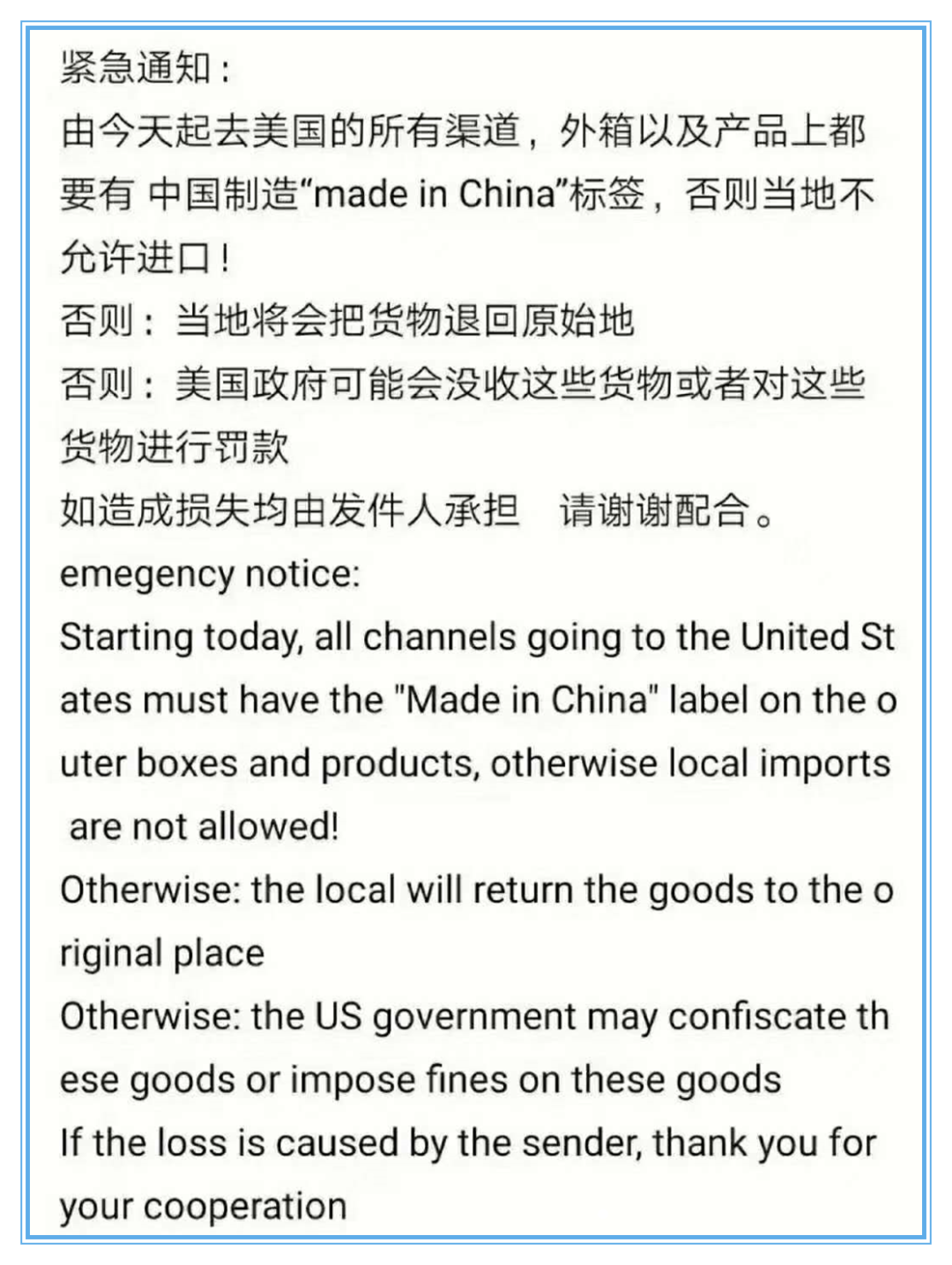 按照美国海关边境要求,即日起通过所有渠道发往美国的货物,外箱以及产品上都需贴上“Made in China”标签,否则当地不允许进口!否则可能面临退货、没收货物或者罚款等风险!