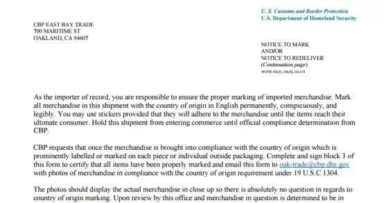 如果碰到查验,CBP要求补贴MADE IN CHINA 标签,在补贴之后,还需要将贴好之后完整的照片发送给CBP,得到确认后,方可安排转运,进入市场销售,这无疑增加卖家的成本,无论是经济上的还是时间上的。