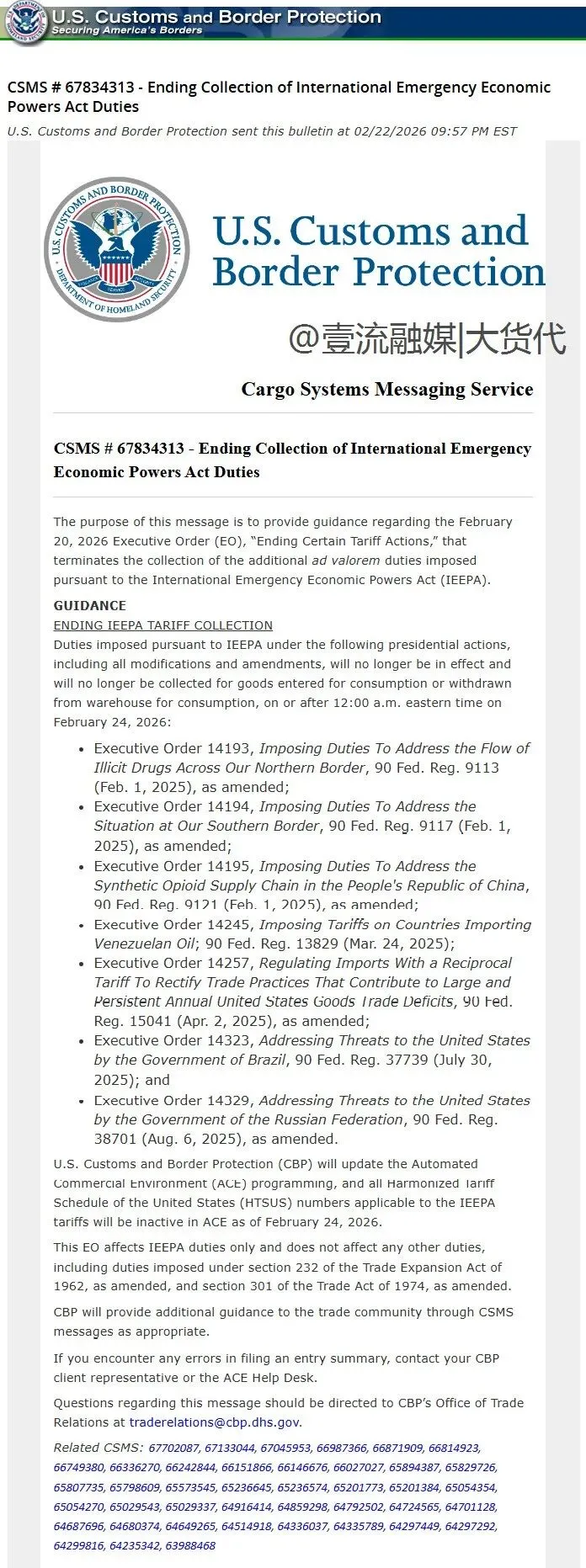 美国海关(CBP):“将更新自动化商业环境系统(ACE)中的相关程序,并停用《美国协调关税表》(HTSUS)中适用于IEEPA关税的相关税则编号。自2026年2月24日起,IEEPA关税在ACE系统中将处于失效状态。”