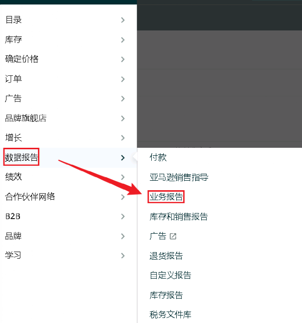 进入卖家中心后,标签栏找到 "数据报告/reports "标签,点击 "业务报告business reports"。