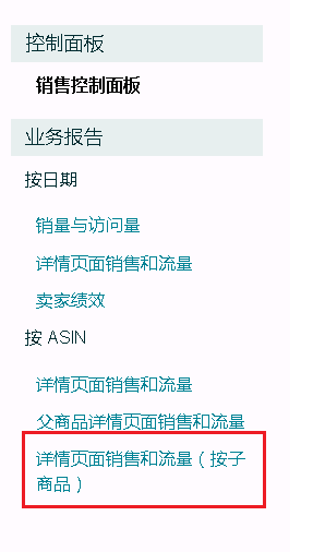 在左边,你会看到报告菜单,有几个选项。点击 "详情页面销售和流量(按子商品)"。