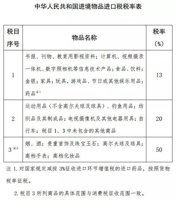 经国务院批准,国务院关税税则委员会决定,自4月9日起调整进境物品进口税。一是将税目1、2的税率分别由现行15%、25%调降为13%、20%;二是将税目1“药品”的注释修改为,对国家规定减按3%征收进口环节增值税的进口药品(目前包括抗癌药和罕见病药),按照货物税率征税。