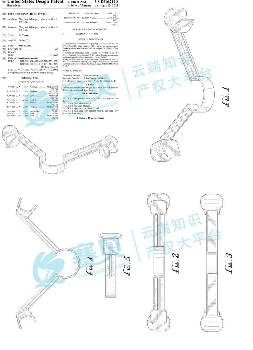 涉案产品涉及两项美国专利,均为脸部和唇部锻炼一相关专利,专利号分别为 USD916211 和 USD929510。其中,USD916211 专利于 2021 年 4 月 13 日获得授权;USD929510 专利则于 2021 年 8 月 31 日下证。,在此之后上架的相关外观产品或有侵权风险。