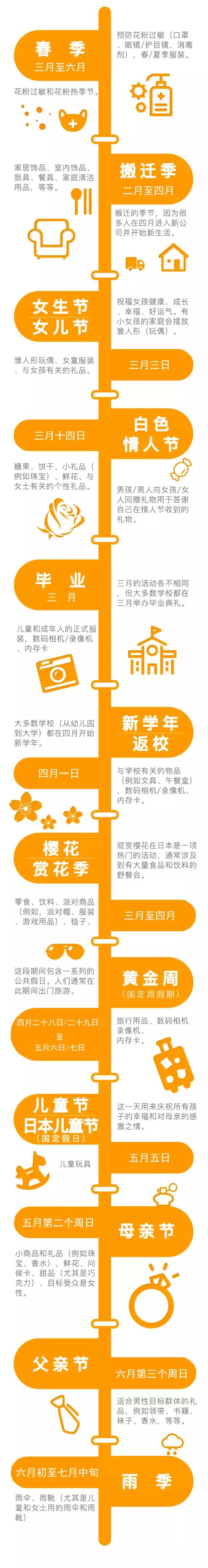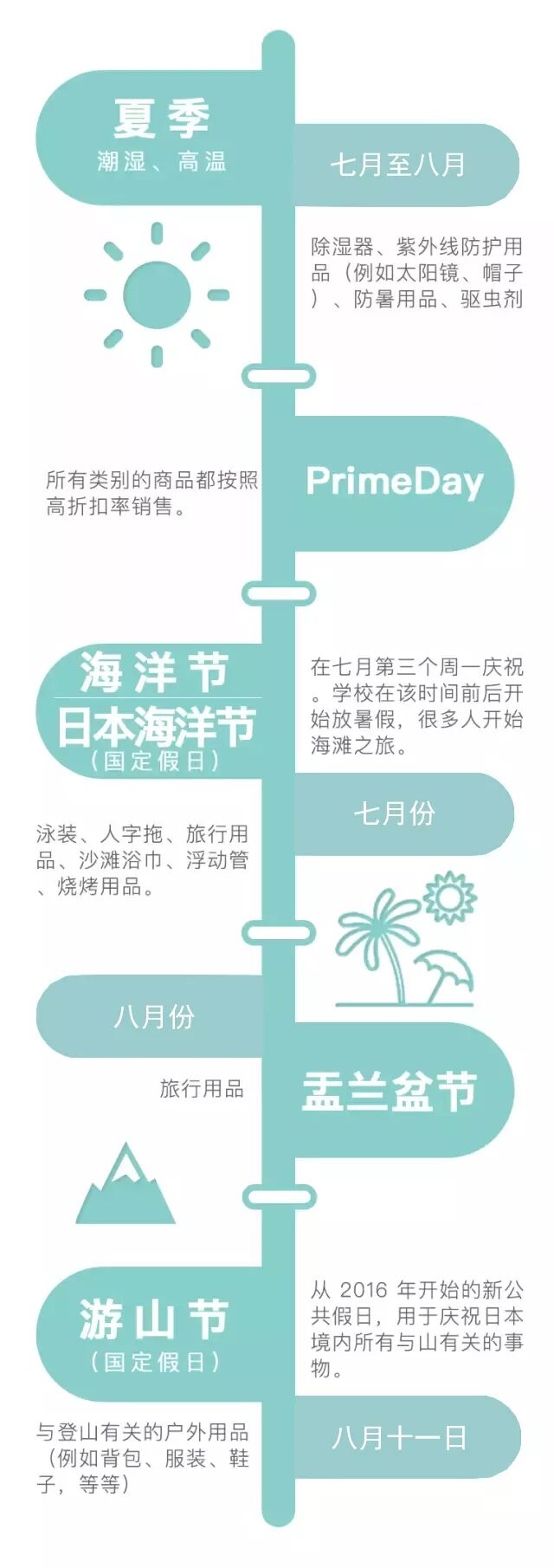 春季 节日荟萃,一年伊始 在春季,日本的节日十分集中。不同于其他大部分国家,春季也是日本公司新财年和学校新学年的开端。为此,亚马逊日本还专门设定了春季大促。下面这些就是日本春季的重要节点和可能畅销的商品。 夏季 PrimeDay和盂兰盆节 每年7月举办的PrimeDay是亚马逊全年最大的一场促销盛宴,期间,亚马逊全站的流量甚至能超过黑五、圣诞的流量,因此把握PrimeDay是卖家提升全年销量的关键节点。 夏季还有日本超重要的一个节日——盂兰盆节,这是日本国内仅次于元旦的重要节日。在盂兰盆节,人们纷纷返乡祭祖扫墓,各个地方也会举办烟火大会,因此旅行用品在这个时候颇具优势。 此外,夏季还有其他重要的流量节点。 秋季 销售进入旺季 相比于上半年,下半年本来就是销售旺季。这时候再利用好各种节假日,往往可以达到事半功倍的效果。 冬季 圣诞、除夕与冬歇期 进入冬季和年末后,冬季用品、派对用品和礼物类商品畅销起来。等岁末年初密集的节日过去之后,日本在一月份可能迎来销售淡季,与中国的春节类似,此时大家纷纷返乡,物流也相对停滞。卖家正好可以趁此机会选品、调整计划。