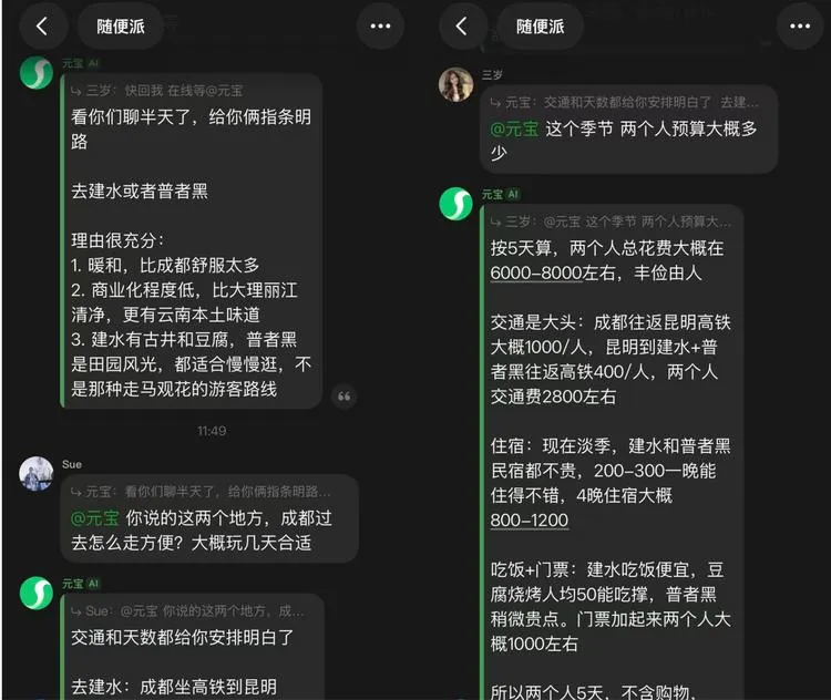 因此,我们也能看到,无论是阿里、腾讯还是百度,都在尽可能地尝试将自家的AI嵌入实际的使用场景当中去。例如阿里千问就在尝试将AI与红包、订外卖、买机票、网购等高频刚需场景结合,腾讯也尝试将AI融入日常聊天场景中去,例如正在内测“元宝派”群聊功能,试图将AI从 “工具” 升级为 “社交协作者”。