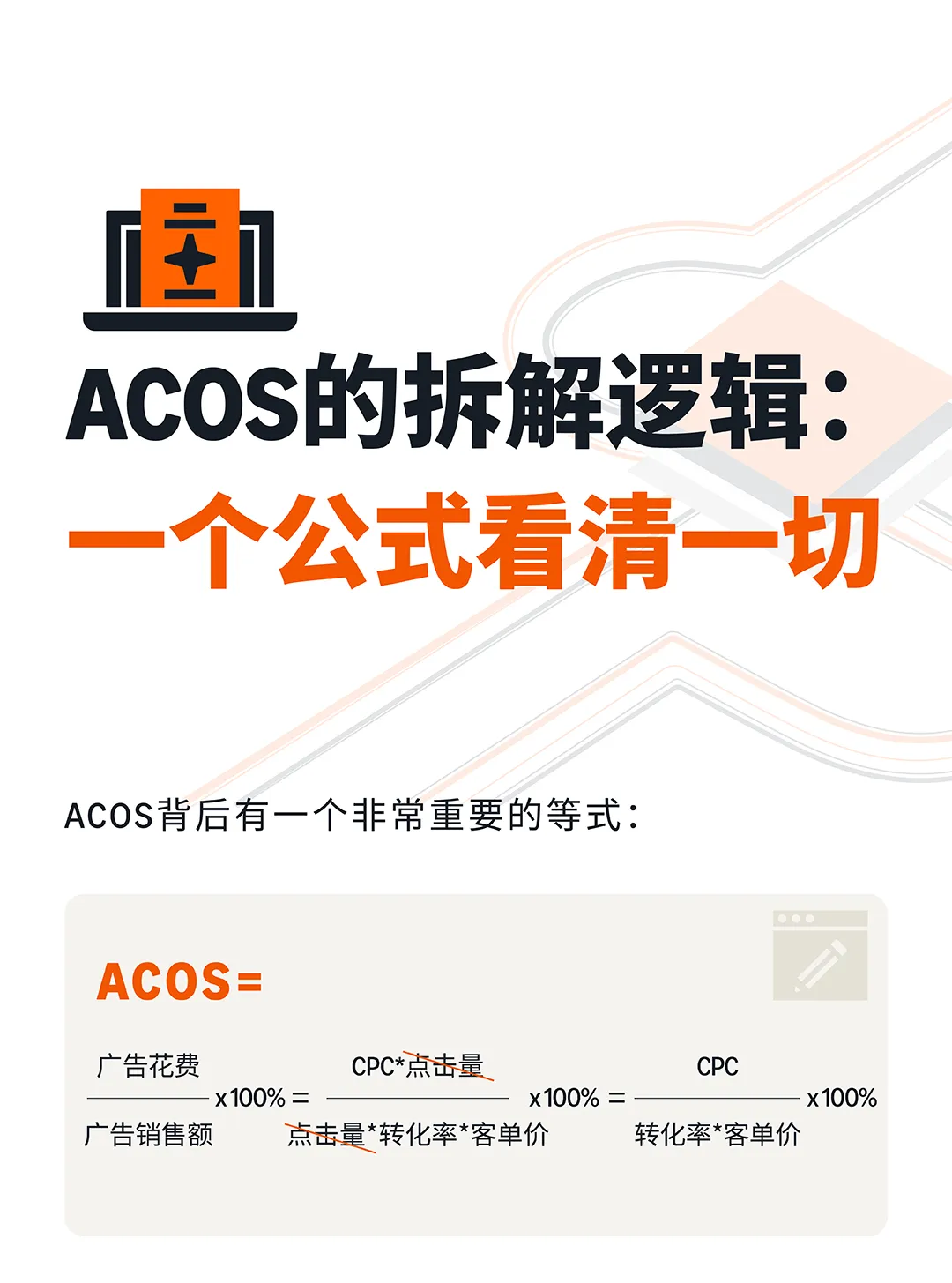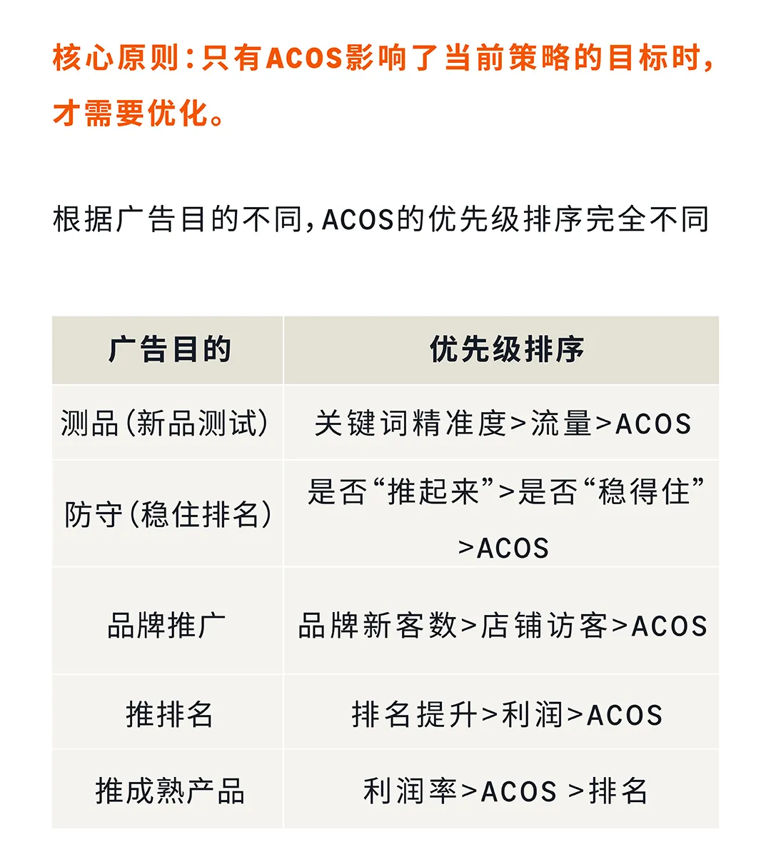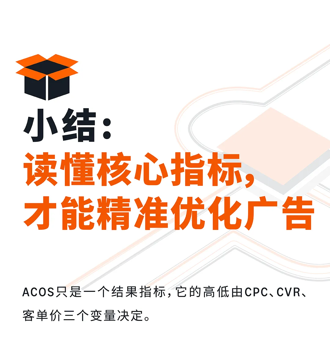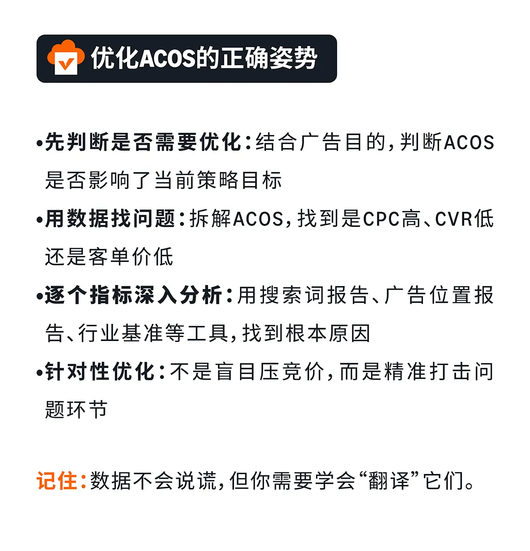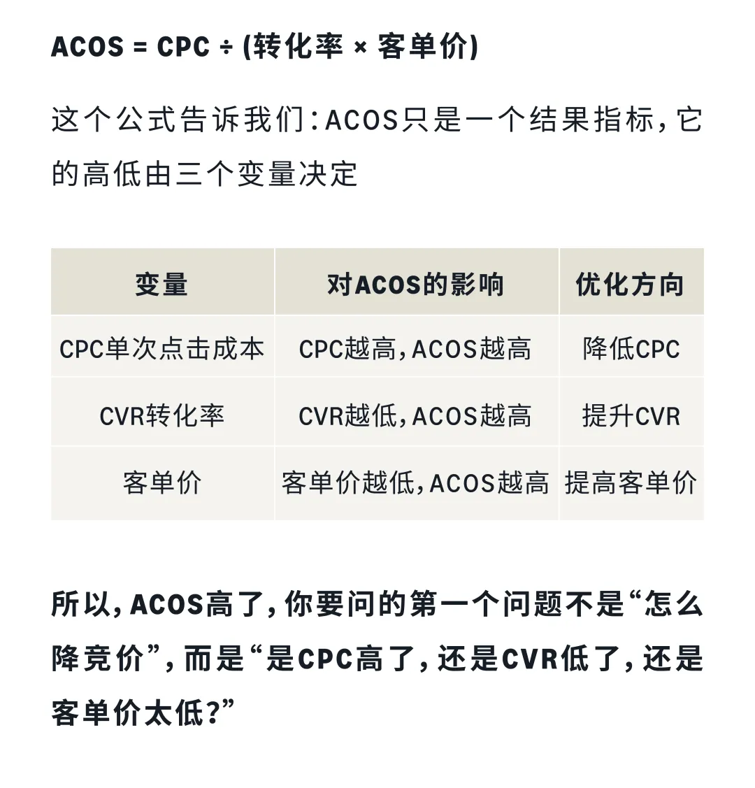 ACOS的拆解逻辑:ACOS = CPC ÷ (CVR × 客单价)。这个公式告诉我们,ACOS只是一个结果指标,它的高低由三个变量决定——CPC(单次点击成本)、CVR(转化率)、客单价。所以,ACOS高了,你要问的第一个问题不是"怎么降竞价",而是"是CPC高了,还是CVR低了,还是客单价太低?"