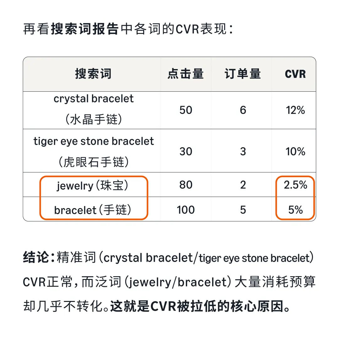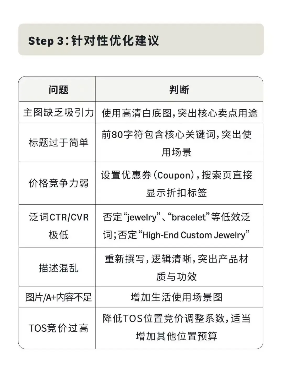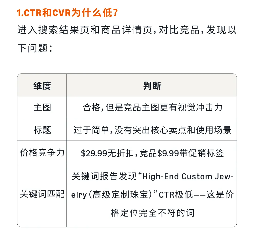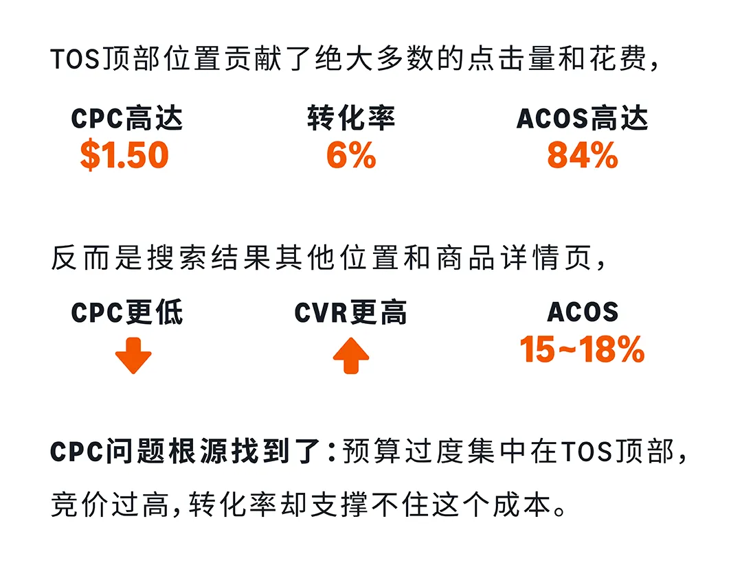 实战案例:某水晶珠宝品牌,客单价$25,毛利率40%,当前ACOS 35%。通过三步诊断法:①结合策略目标,查看整体数据,发现CPC高、CTR低、CVR低;②逐个指标深入分析,发现泛词(jewelry/bracelet)大量消耗预算却几乎不转化,TOS顶部位置CPC高达$1.50但CVR只有6%;③针对性优化,否定低效泛词,降低TOS竞价,优化主图和标题。