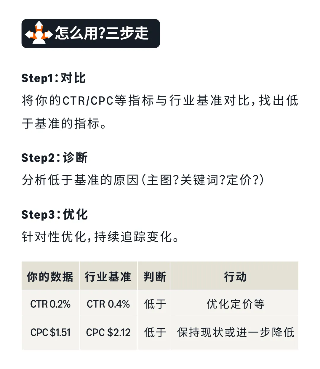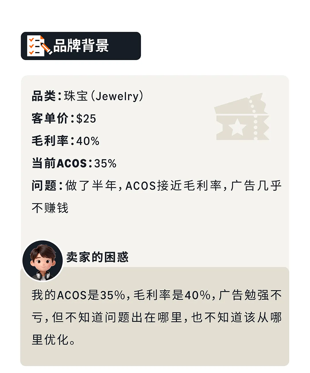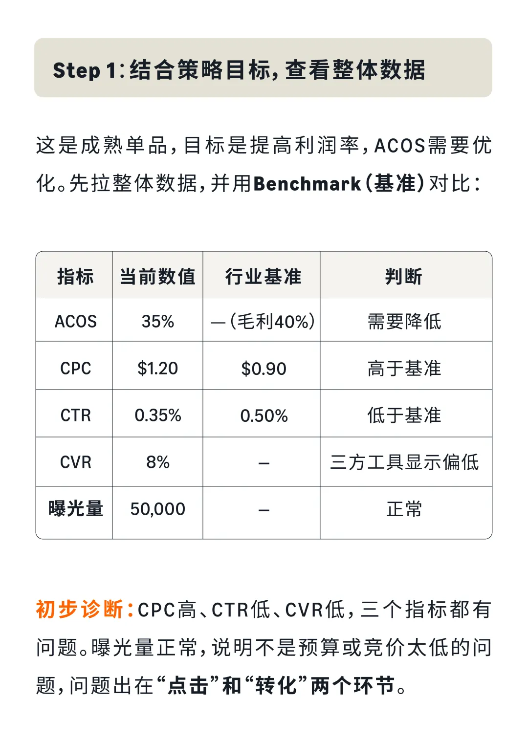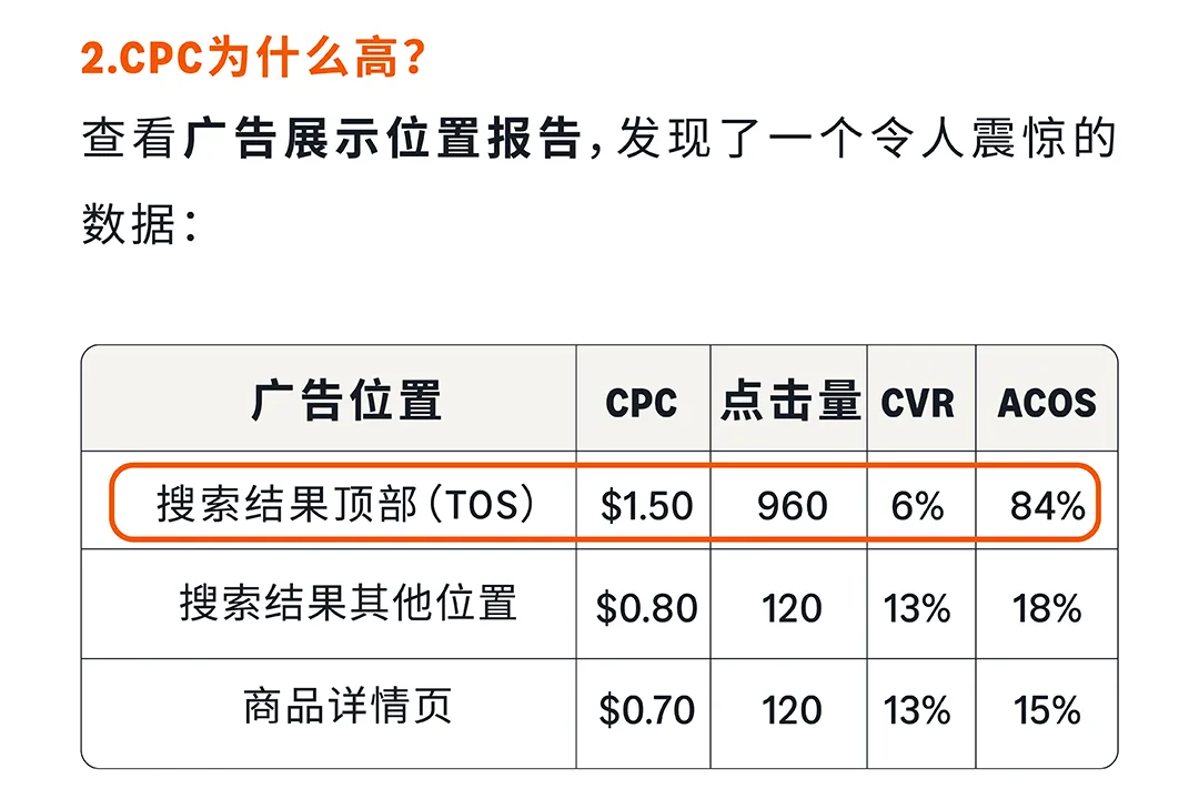 实战案例:某水晶珠宝品牌,客单价$25,毛利率40%,当前ACOS 35%。通过三步诊断法:①结合策略目标,查看整体数据,发现CPC高、CTR低、CVR低;②逐个指标深入分析,发现泛词(jewelry/bracelet)大量消耗预算却几乎不转化,TOS顶部位置CPC高达$1.50但CVR只有6%;③针对性优化,否定低效泛词,降低TOS竞价,优化主图和标题。