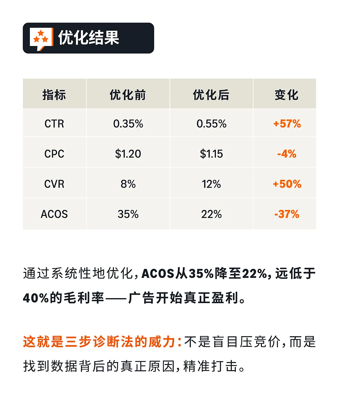 优化结果:3个月内,CTR从0.35%提升至0.55%(+57%),CVR从8%提升至12%(+50%),ACOS从35%降至22%(-37%),远低于40%的毛利率——广告开始真正盈利。