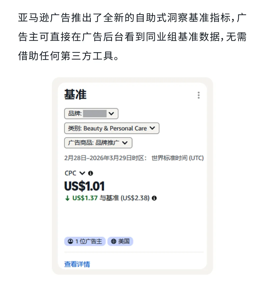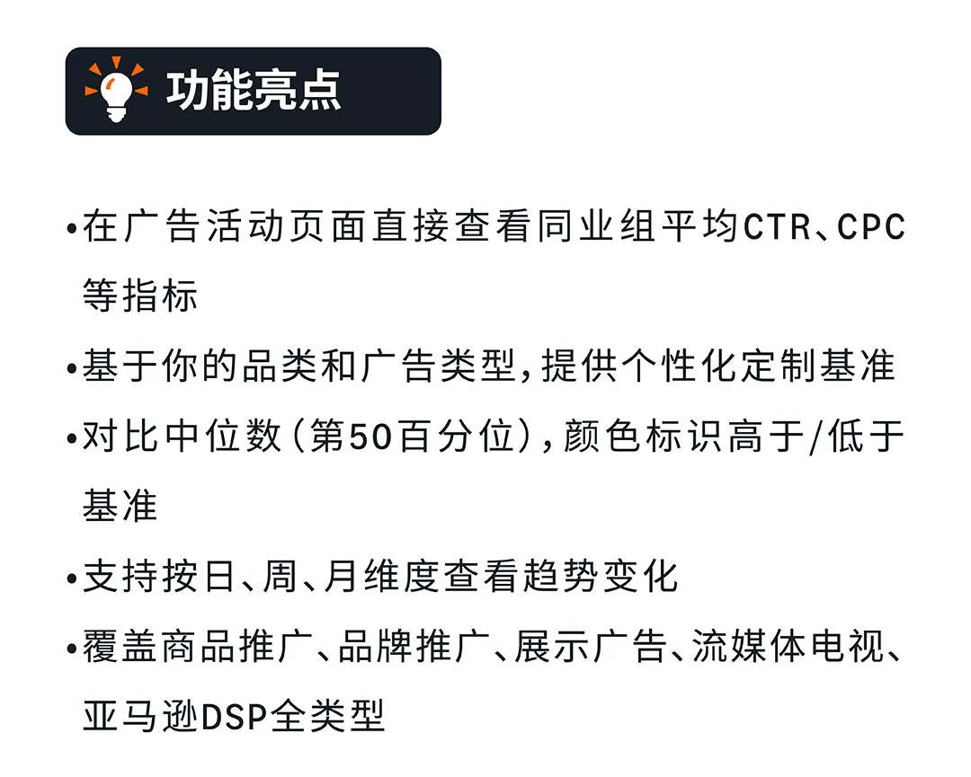新功能Benchmark:亚马逊广告平台推出了全新的基准(Benchmark),直接在广告后台就能看到同业对比数据,无需借助任何第三方工具。在广告活动页面直接查看同业组平均CTR、CPC等指标,对比中位数,找出低于基准的指标,针对性优化。