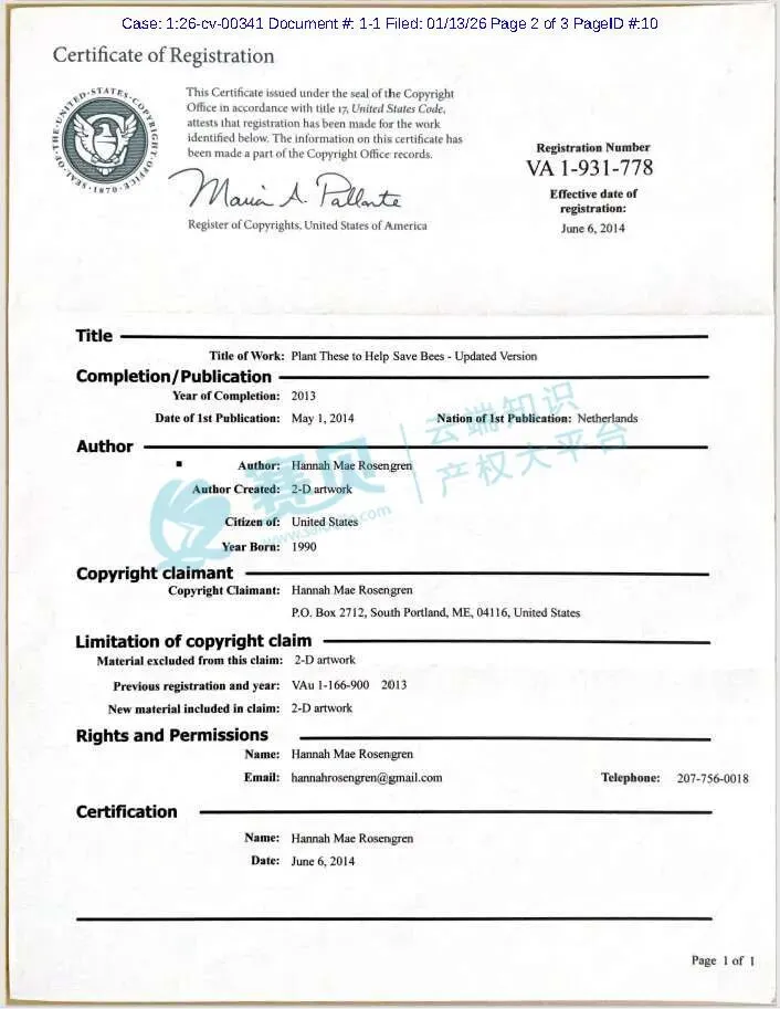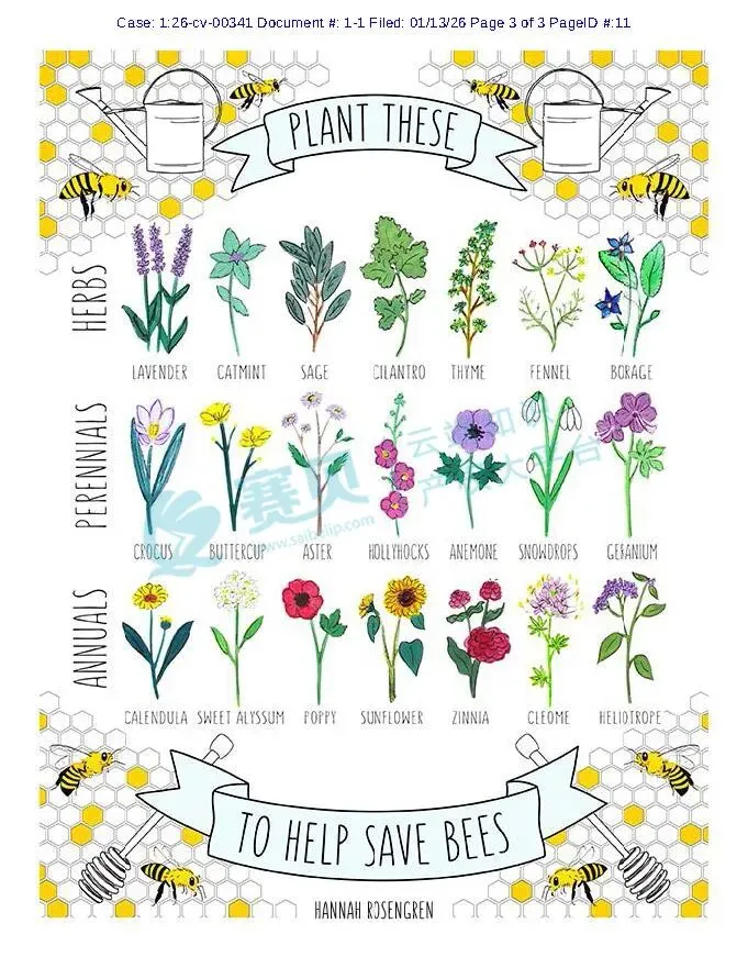 【26-cv-341】一张蜜蜂植物插画告70家跨境店铺,Hannah Mae Rosengren发起版权侵权TRO诉讼!