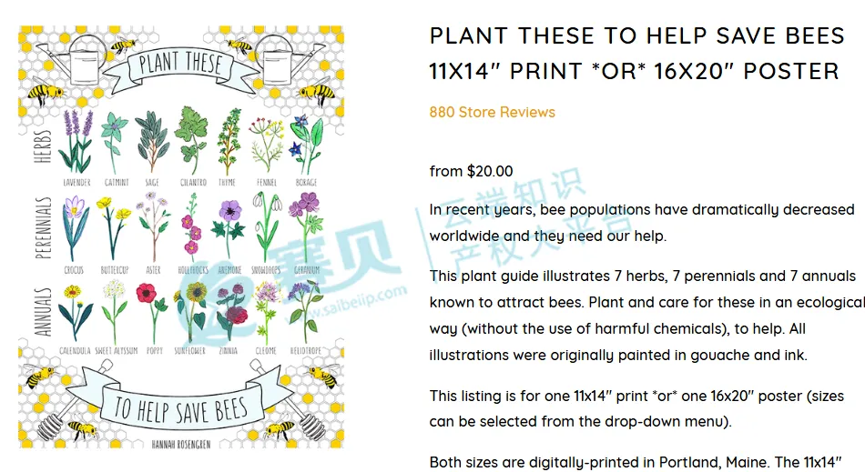 本次维权的是原告的原创插画作品《Plant These to Help Save Bees - Updated Version》(《种植这些植物拯救蜜蜂 - 升级版》)。这款作品早在 2013 年就已完成创作,2014年5月在荷兰首次出版,注册号 VA 1-931-778,未经书面许可,在产品上复制、使用该插画的核心设计元素,或者销售带有该插画衍生图案的产品,哪怕只是部分相似,都可能构成侵权。
