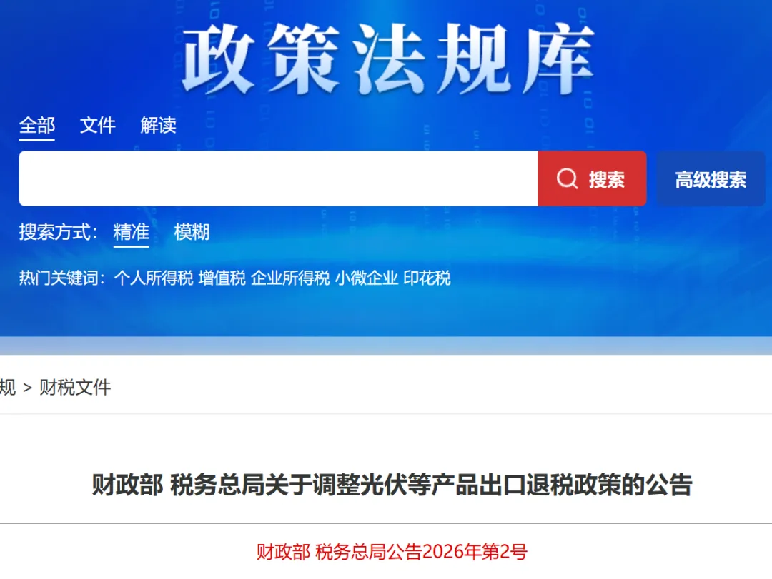 自2026年4月1日起,光伏产品等产品的增值税出口退税将取消。2026年4月1日至2026年12月31日期间,电池产品的增值税出口退税率由9%降至6%;自2027年1月1日起,电池产品的增值税出口退税将取消。