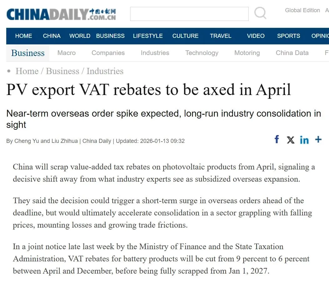 中国日报:光伏出口增值税退税将于4月取消,预计近期海外订单将激增