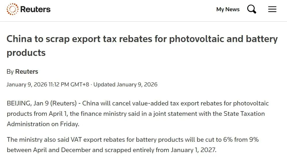 Starting from April 1, 2026, the VAT export tax rebate for products such as photovoltaic products will be canceled. From April 1, 2026, to December 31, 2026, the VAT export tax rebate rate for battery products will be reduced from 9% to 6%; starting from January 1, 2027, the VAT export tax rebate for battery products will be canceled.