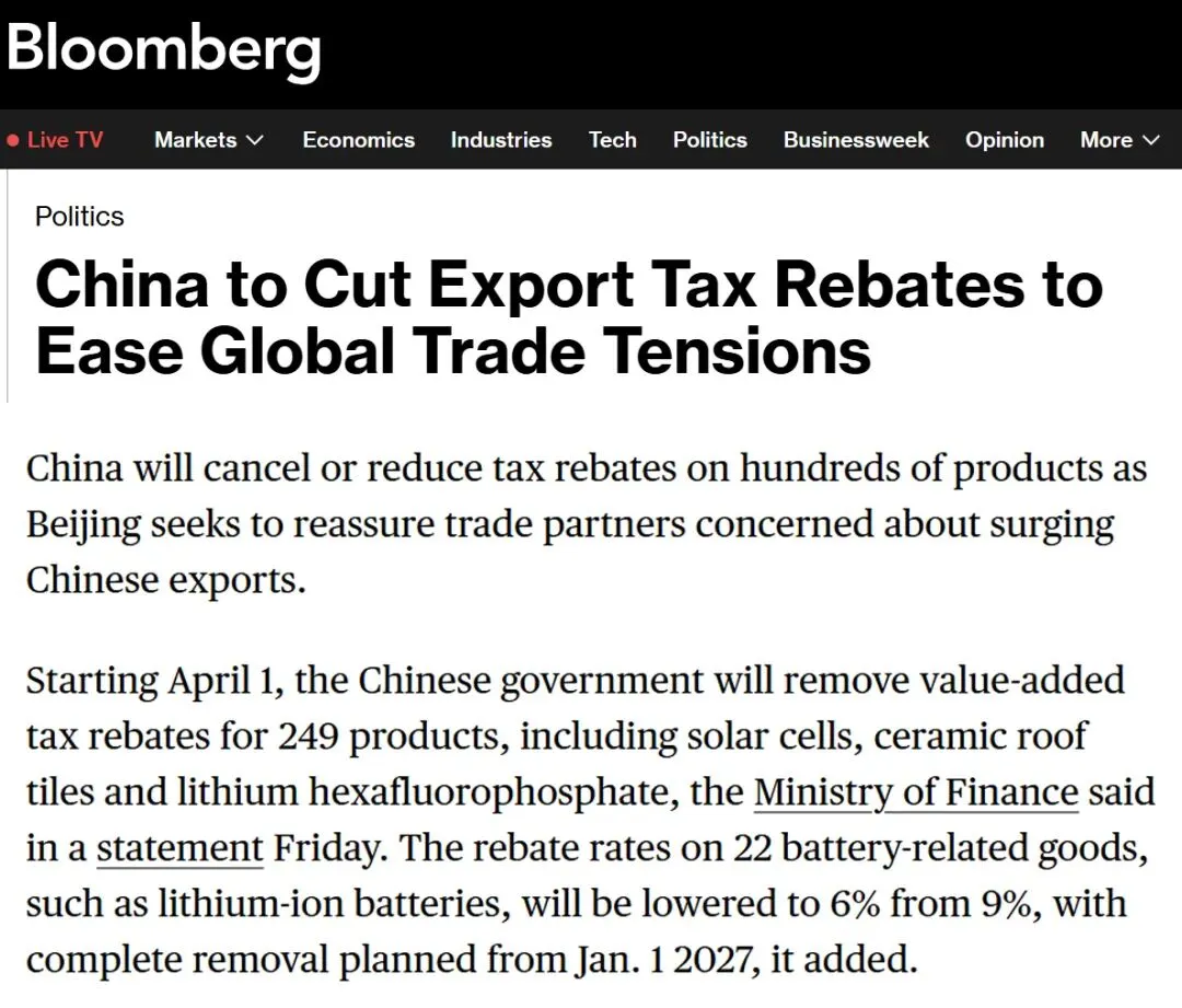Reuters: China to scrap export tax rebates for photovoltaic and battery products