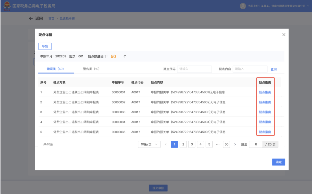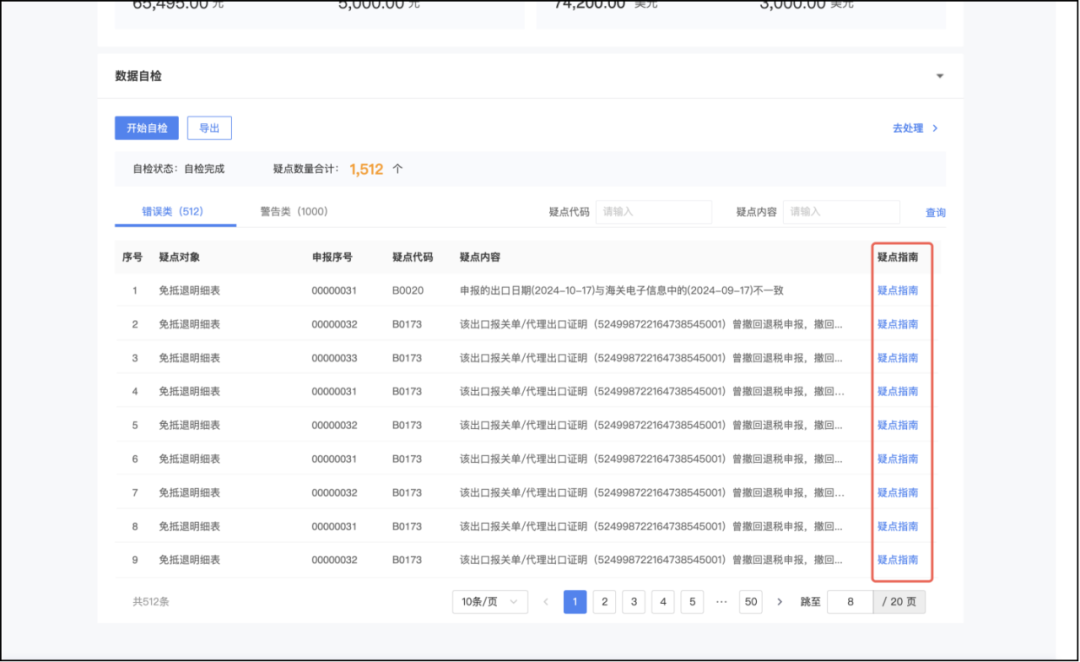 点击“我要办税—出口退税管理—免退税申报”,填写完数据后,可进行数据自检功能,点击“开始自检”完成数据自检后,可查看疑点信息,如下图所示: