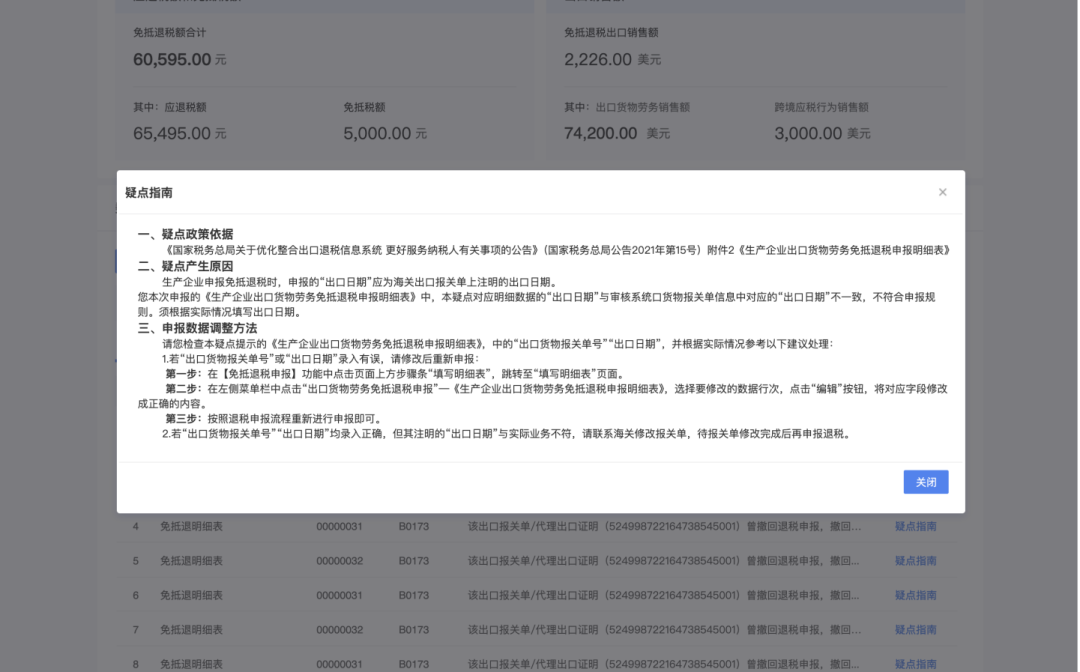 纳税人通过新电局进行出口退税各类业务申报时,在完成“数据自检”后,可点击“数据自检情况”列疑点数量,在“疑点详情”页面查看申报数据自检生成的疑点明细,点击右侧“疑点指南”,系统自动根据“疑点编号”弹出对应的“疑点指南”页面。