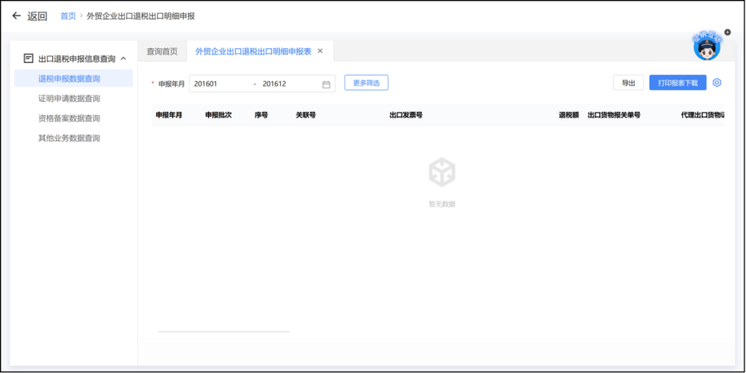 调整“我要查询—一户式查询—出口退税申报信息查询”下“外贸企业出口退税出口明细申报”功能,可查询2016年到2020年的申报数据。