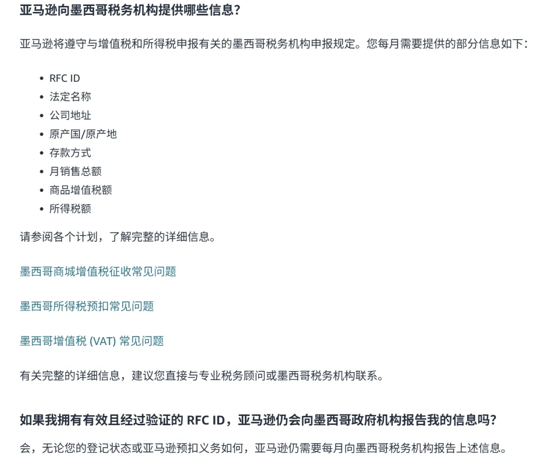自2026年4月30日起,亚马逊将依据《联邦税法典》(CFF)第30-B条款,履行墨西哥税务透明度要求,向墨西哥税务机关(SAT)提供对特定市场交易信息的实时在线访问权限,这是在墨西哥运营的数字平台的法定义务。